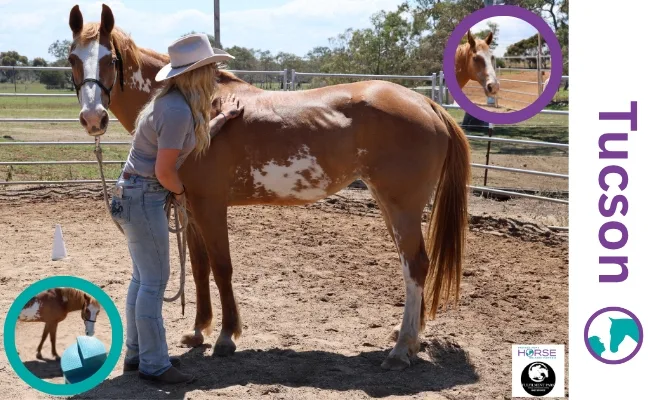 Tucson is a striking 17-year-old, 15.1hh Paint mare with a story of resilience and second chances.