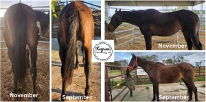 Mocca has been with Jess at Keyson Park Breaking and Training Centre for just on 2 months now. The first issue to contend with was that Mocca was riddled with lice, so Jess used that as a training experience for handling initially. Jess has done an amazing job with Mocca, not only from a training perspective but also helping her achieve steady weight gain and improved health. Mocca had a massive worm burden and considering what came out, it was surprising she didn’t colic. Each day, each session, Jess and Mocca are finding their way together, and Mocca is becoming a lot more accustomed to people and showing really positive signs.