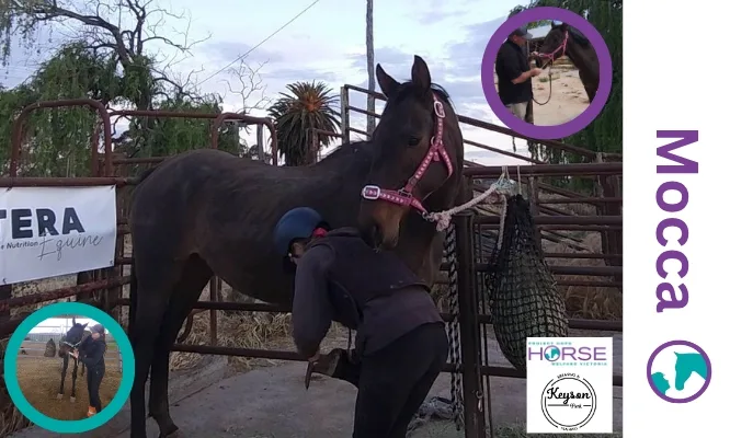 Jess has begun to establish good habits with Mocca, including grooming, picking up legs, and tying up. With more handling, Mocca has now had her dental visit, so we believe she is around 10 years old. She’s a 15hh brown Thoroughbred mare with a bright future ahead. She came to us after her previous owner couldn’t provide the care she needed, and we’re thrilled to give her a second chance at a happy life. She was one of three surrendered from the same property as Miffy and Tucson.